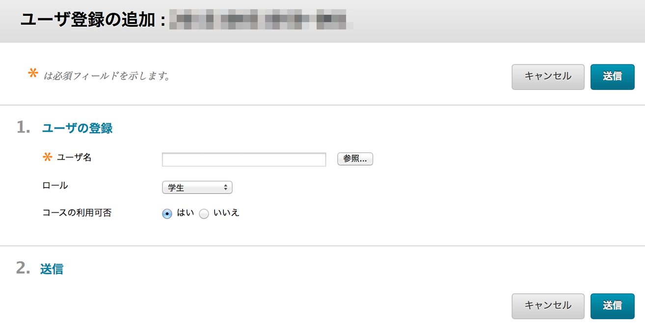 登録したい利用者の広大IDを、[ユーザ名]に記入します。複数の学生を登録する場合には、学生番号をカンマで区切って並べることができます。