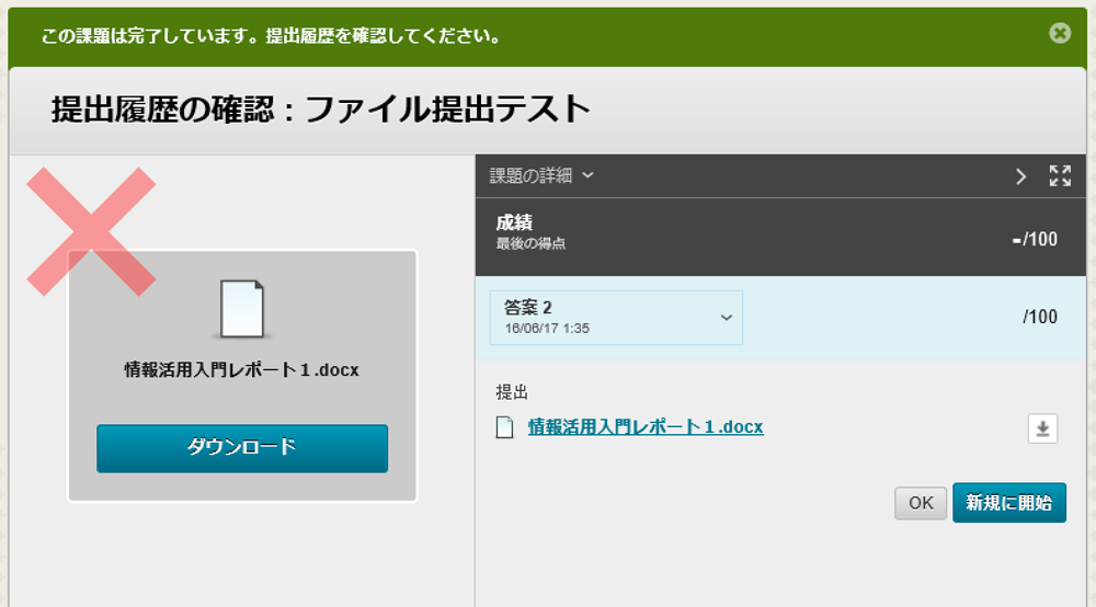 このような場合には、Word/Excel/PowerPointを終了して、[新規に開始]をクリック、再提出をしてください。[新規に開始]がない場合は、再提出ができません。担当の教員に連絡して、再提出できるように設定してもらってください。