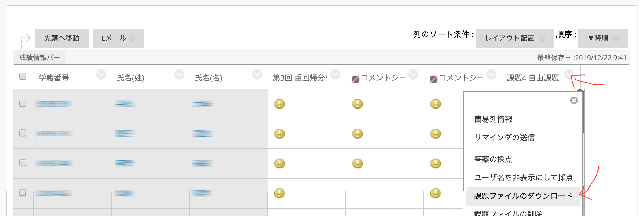 - 全ての答案を選択状態にします。表の先頭の「名前」の左にあるボックスをクリックします。