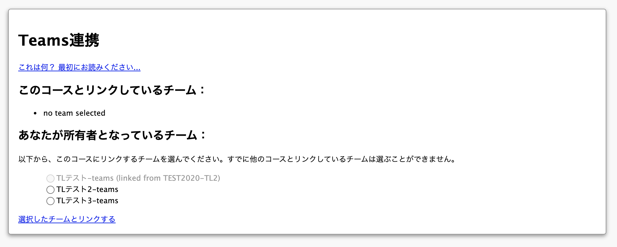 リンクしたいチームを選択し、「選択したチームとリンクする」をクリックしたら設定完了です。「このコースとリンクしているチーム」のところに、選択したチームが表示され、10分以内にコースユーザがチームに登録されます。