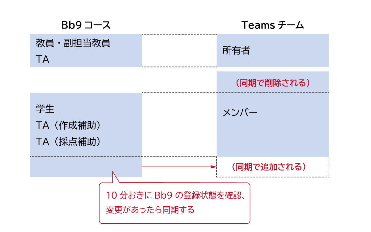 同期はBb9からteamsへの一方向で、10分に一回の頻度で実行されます。すなわち、Bb9で登録追加や削除があったら、10分以内にその変更がTeamsに反映されます。