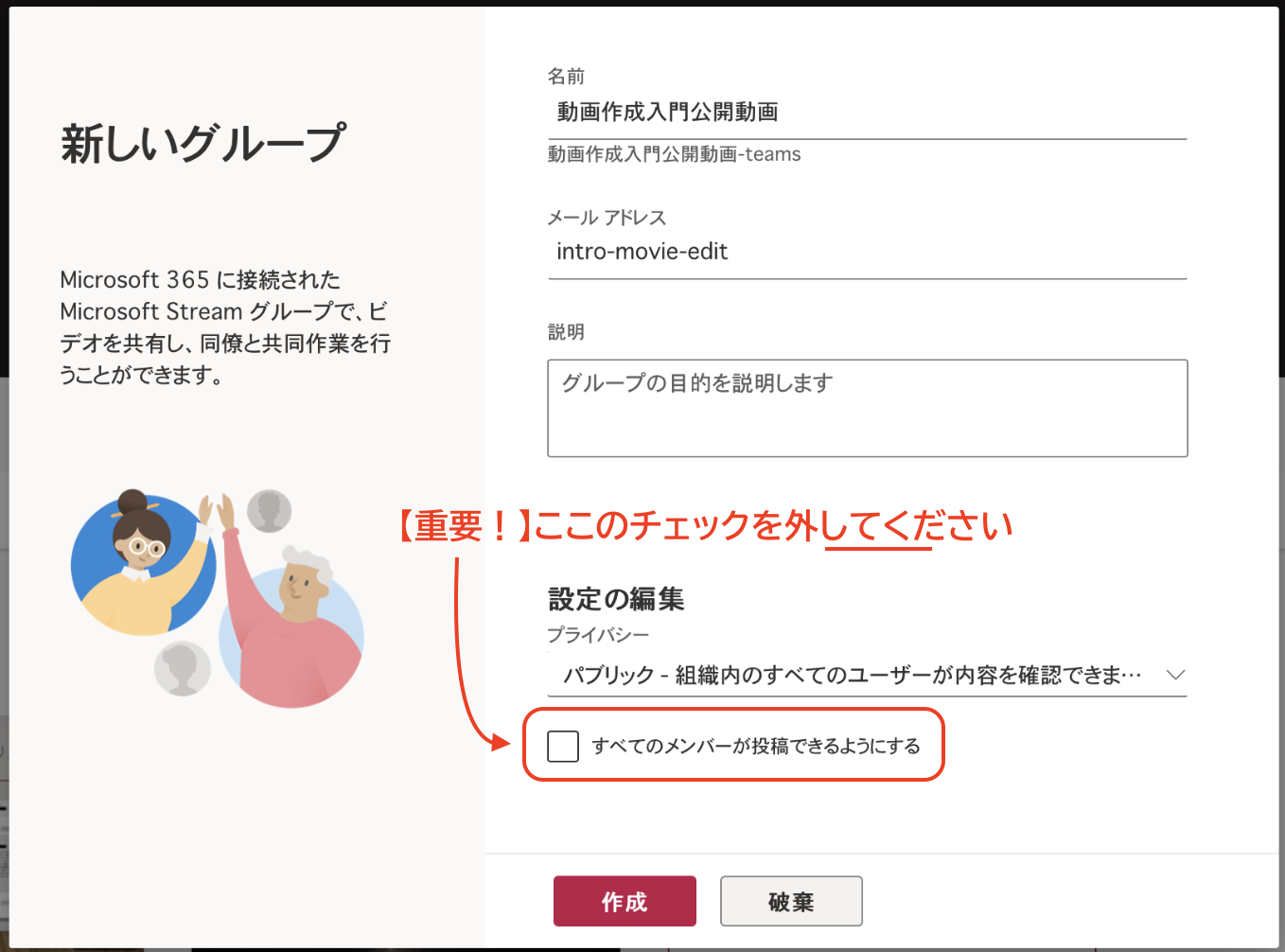 - 「プライバシー」のところで「パブリック - 組織内のすべてのユーザーが内容を確認できます」を選択します